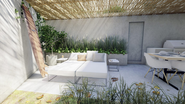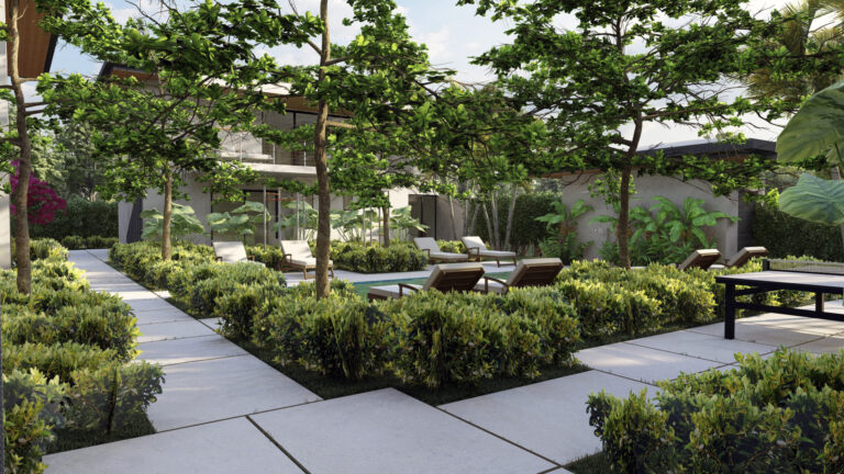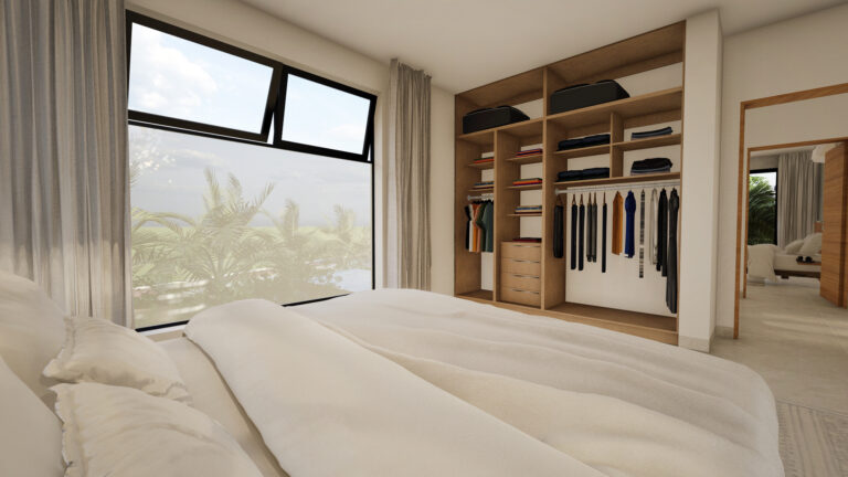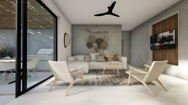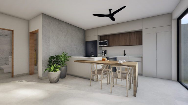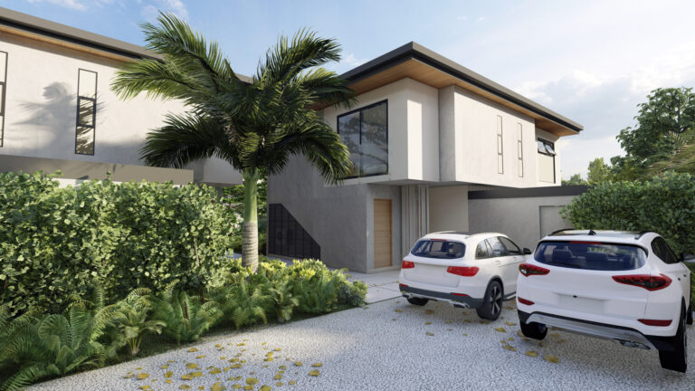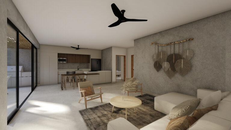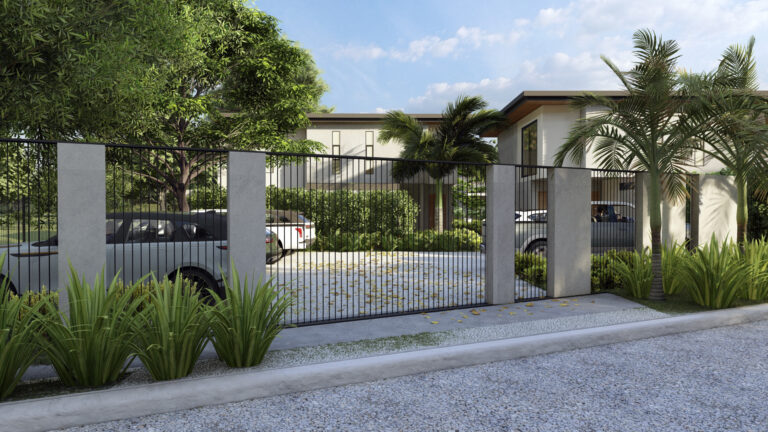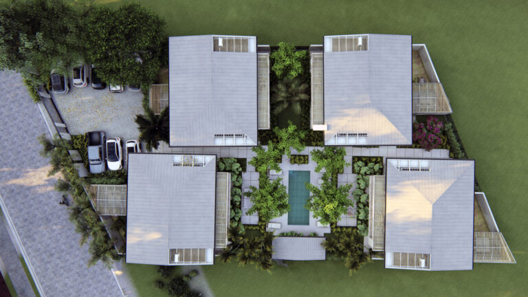 Maha Village is a residential apartment complex situated in a quiet yet central part of Uvita. The beach is only 10 minutes walking distance as are many other amenities. The complex comprises four buildings with two apartments in each. One upstairs, one on ground level. Each unit measures approximately 100sqm. The aim of the project is to provide an option for residents to enjoy the design and amenities usually found in high end tourist resorts. The open layout lets residents cohabitate in common areas and form their own village. Each unit also provides ample outdoor area that provide privacy for it´s residents. The complex has a generous pool that is located in the center of the “village” and a courtyard with ample endemic flora both shared by all residents. The complex also provides an elevated level of security.